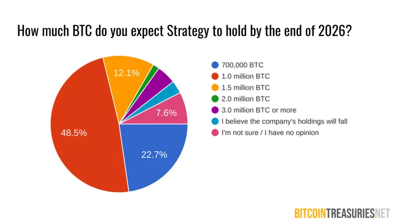 Results show that holdings could skyrocket: almost 90% expect Strategy’s Bitcoin holdings to rise, and almost half expect it to grow ~50% from 671,000 BTC to 1.0 million BTC in 2026.